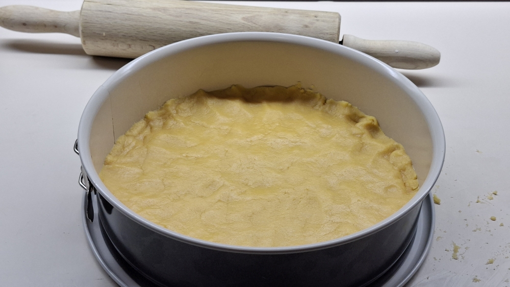Backofen auf 170 Grad vorheizen. Eine Springform einfetten, und diese mit dem Mürbeteig belegen. Im vorgeheizten Ofen ca. 30 Minuten hellbraun backen. In der Form auskühlen lassen.