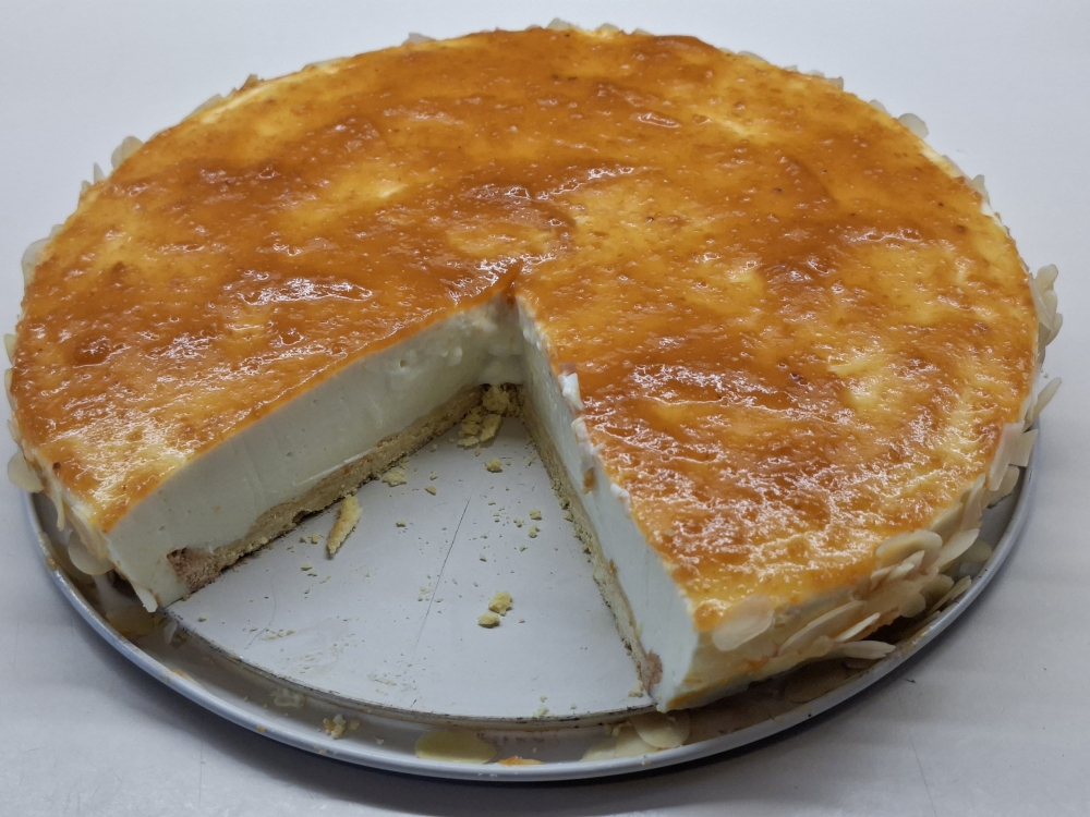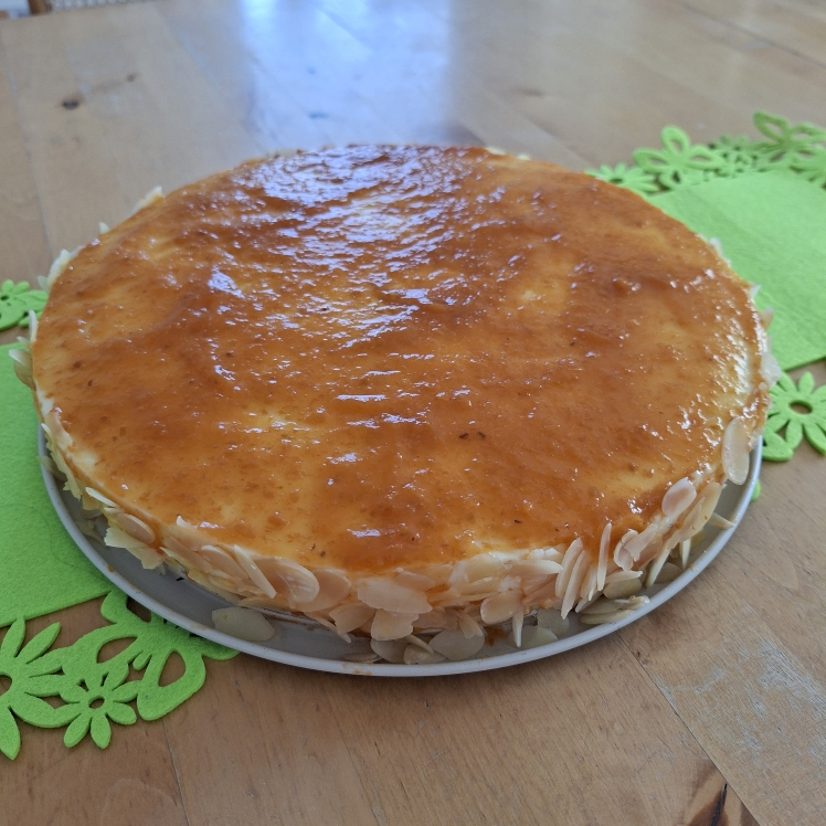 Den Topfen mit den Zutaten bis Orangensaft sowie dem Restzucker (ca 260 g) gut vermischen (20 Sek/St. 5). Die Gelatine nach Herstellerangaben auflösen und in die Topfenmasse einmischen (5 Sek. / St. 5) . Die Masse in die Form füllen, und im Kühlschrank fest werden lassen (dauert etwa 2 h). Danach die Springform abnehmen, Marillenmarmelade erhitzen bis sie flüssig ist, damit die Torte bestreichen und am Rand Mandelblätter damit ankleben. Im Kühlschrank erstarren lassen.